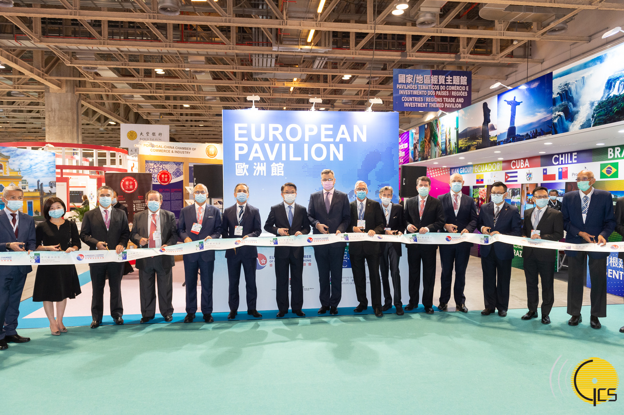 The Secretary for Economy and Finance, Mr Lei Wai Nong, officiates at the opening of European Pavilion set up for the 25th Macao International Trade and Investment Fair (25th MIF), the Macao Franchise Expo 2020 (2020MFE) and the 2020 Portuguese Speaking Countries Products and Services Exhibition (Macao) (2020PLPEX).