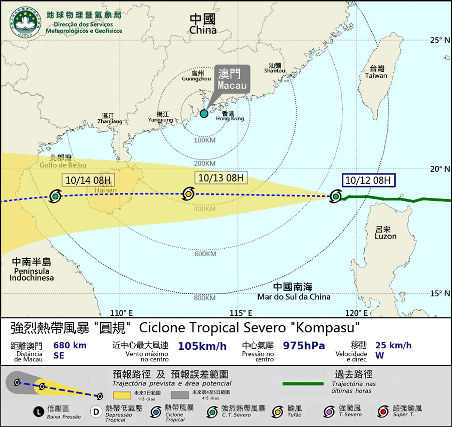 Severe Tropical Storm Kompasu is intensifying gradually. It will move across the northern part of the South China Sea in these two days, and come closest to Macao between midnight and morning on 13th, at a distance of around 400km south to Macao. It will move in the general direction to the Hainan.