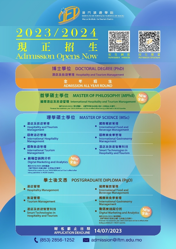 Scholarships are available for postgraduate programmes. Admissions to the postgraduate diploma and master's degree programmes for the academic year 2023/2024 are open until 14/07/2023, and admissions to doctoral degree programme are open throughout the year. Please visit the IFTM Admission website at https://www.iftm.edu.mo/admission for details.