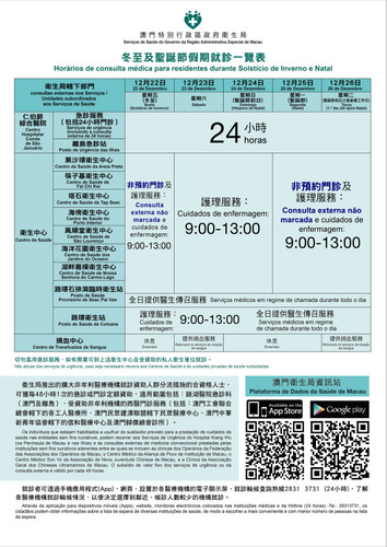 - Nos Centros de Saúde as consultas externas não marcadas serão prestadas nos dias 22, 25 e 26 de Dezembro, das 09h00 às 13h00, e cuidados de enfermagem serão prestados nos dias 22 a 26 de Dezembro, das 09h00 às 13h00, nos Centros de Saúde da Areia Preta, de Fai Chi Kei, de Tap Seac, do Porto Interior, de São Lourenço, da Taipa (Jardins do Oceano), Nossa Senhora do Carmo - Lago e Posto Provisório de Saúde Seac Pai Van em Coloane; em adição, o Posto Provisório de Seac Pai Van em Coloane também prestará serviços médicos em regime de chamada telefónica durante as 24 horas, enquanto no Posto de Saúde de Coloane, entre os dias 22 e 26 de Dezembro, serão proporcionados cuidados de enfermagem das 09h00 às 13h00 e serviços médicos em regime de chamada durante 24 horas;
