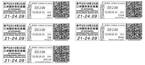 Para acompanhar a realização da “35ª Exposição Internacional Asiática de Filatelia, Macau 2018”, a Direcção dos Serviços de Correios e Telecomunicações informa que, entre os dias 1 de Agosto de 2018 e 24 de Setembro de 2018, será utilizado nas estações postais com instalação de máquinas de venda de etiquetas postais, nomeadamente as de Mong Ha, da Rua de Carmo, de Seac Pai Van, da Universidade de Macau, e também na Loja do Museu das Comunicações, um novo modelo de etiqueta com impressão de flâmula publicitária, conforme exemplares abaixo ilustrados. Esta etiqueta será utilizada apenas na aceitação de cartas, pequenos pacotes e impressos, e não será vendida de forma avulsa.