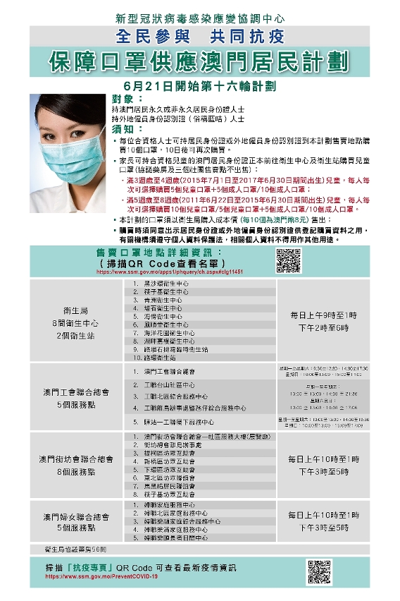 第十六轮计划的实施方式、售卖点及时间与第十五轮相同。而计划的对象为本澳永久及非永久居民、持外地雇员身份认别证(俗称蓝咭)人士;卫生局辖下卫生中心及卫生站、卫生局协议药房、本澳三个社团(工联、街总、妇联)继续提供售卖口罩服务,即全澳共有84个售卖点,详情见附图。