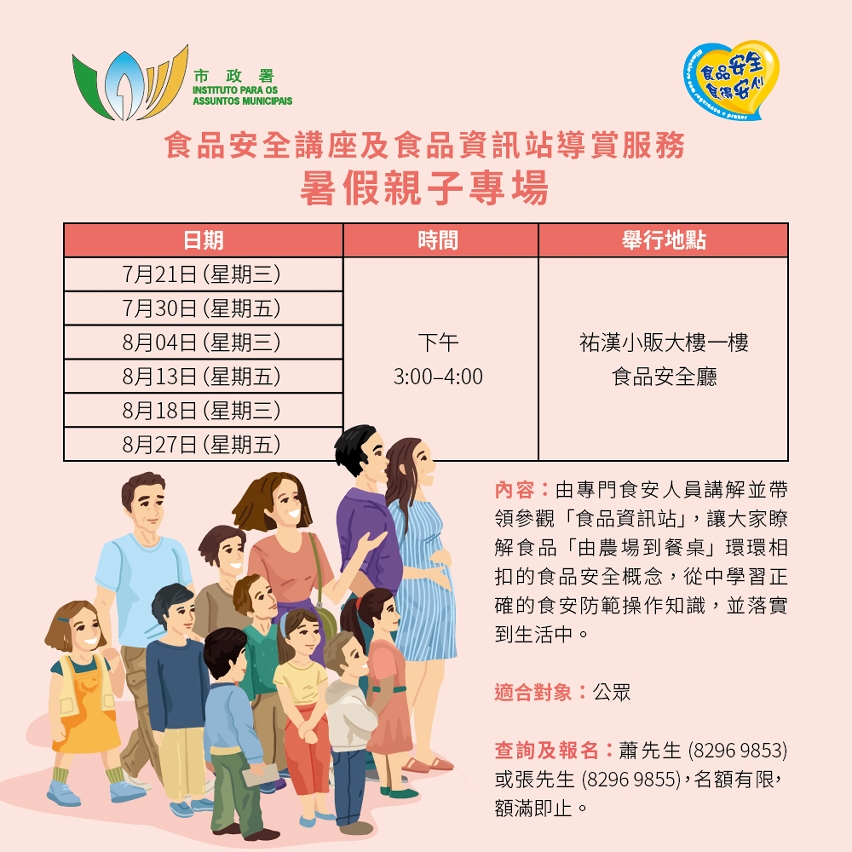 暑期親子專場活動將分別於七月二十一日、三十日、八月四日、十三日、十八日及二十七日下午三時至四時,於祐漢小販大樓一樓舉行,分為“食品安全講座”及“食品資訊站展館導賞”兩部分,由市政署食安人員深入講解“由農場到餐桌”的食安知識,並透過參觀食品資訊站的五個不同展區,切實瞭解食品由種植、生產、運輸、銷售,以至烹煮等過程中環環相扣的食安資訊,從而引導參加者思考及關心食品安全的各種問題,學習及掌握謹慎選購、生熟分開、徹底煮熟等重要的食安操作原則,並落實到生活之中,減低日常生活中的食安風險。