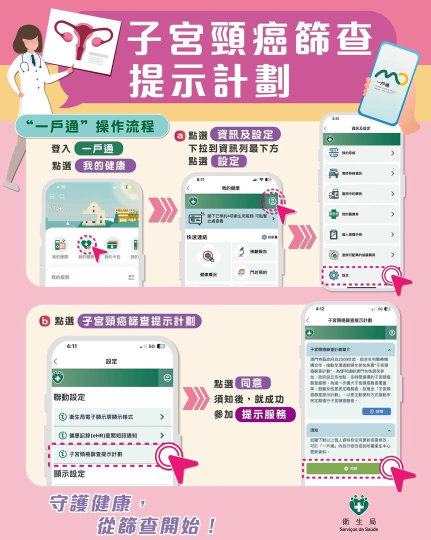 值得指出的是,癌症防治是一項長期而艱巨的任務,透過特區政府引領、社團機構協作、全體居民共同參與和努力,澳門有望進一步控制癌症發病率和降低死亡率,讓居民更健康。在子宮頸癌篩查方面,衛生局早於40年前開始推行相關工作並逐步擴展,至2009年與非牟利機構合作,將免費篩查服務擴展至全澳居民。今年3月與非牟利機構合作開展“子宮頸癌篩查提示計劃”,由工作人員致電提醒及協助參加者預約篩查;今年5月與婦女聯合總會合作在“一戶通”增加“子宮頸癌篩查快速通道” 預約。此外,衛生局正推行“HPV自採先導計劃”,引入世界衛生組織推薦的新型篩查方式,讓居民可在家中自行採樣,現階段收集相關數據進行分析,為未來計劃奠定數據基礎。衛生局建議,有性經驗的女性自21歲起需定期接受篩查,且持續至65歲。