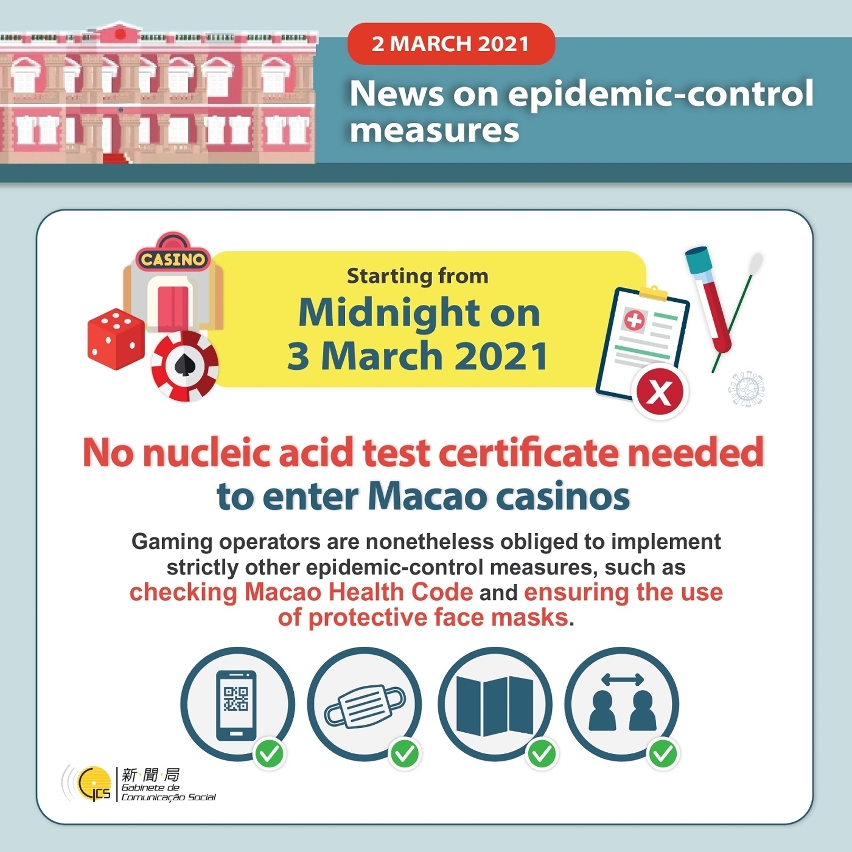 The requirement for people to present a nucleic acid test certificate proving they are negative for COVID-19 infection, in order to enter a Macao casino, will be lifted after the stroke of midnight on Wednesday (3 March).