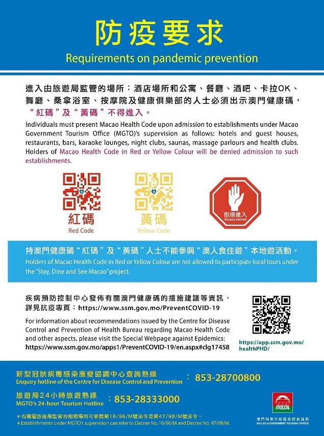 1. The following premises must require persons entering to present a Macao Health Code declaration: casinos; hotels and guest houses; immigration halls and other related buildings; and medical institutions.