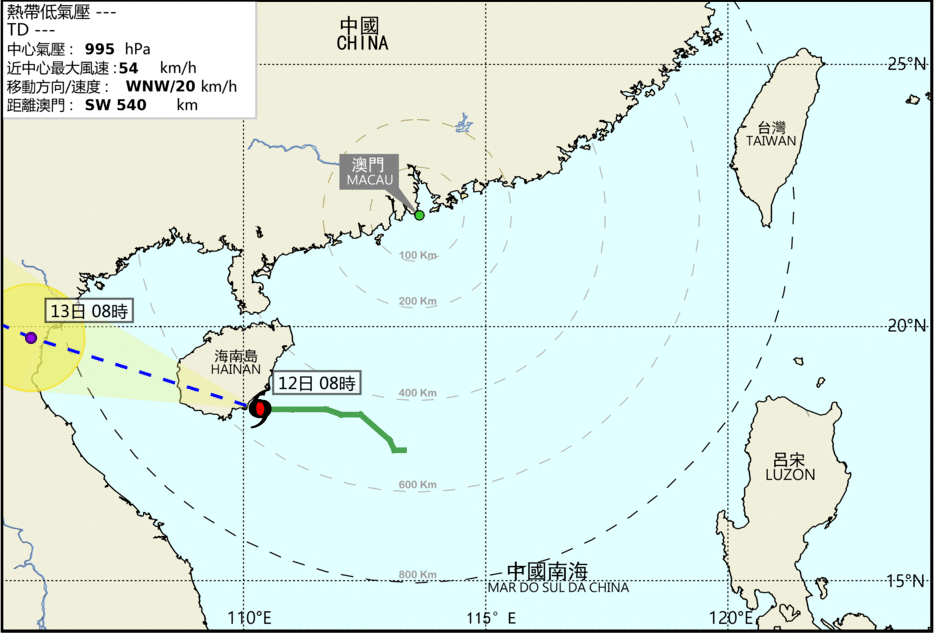 The tropical depression has made landfall on Hainan Island, it is going to enter the Beibu Gulf later. The Signal No.1 will remain in effect during the day. However, its related outer rainbands will keep on bringing thundery showers to Macao with moderate winds. The public are advised to pay attention to the change in weather.