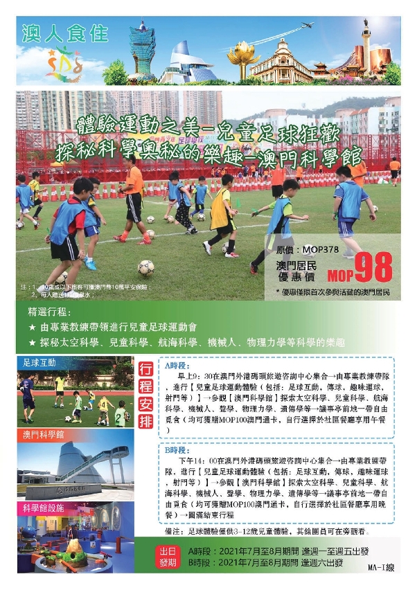 The local tour itineraries of the second phase of the “Stay, Dine and See Macao” project incorporate various innovative elements. The itineraries under “Maritime Tour Series”, “Adventure·Fun Series” and “Parent & Child·Sports·DIY Series” are especially popular with many signups among other routes. To cater for residents’ need to spend summer vacation in Macao during the pandemic, tour groups will set off daily for some of the itineraries.
