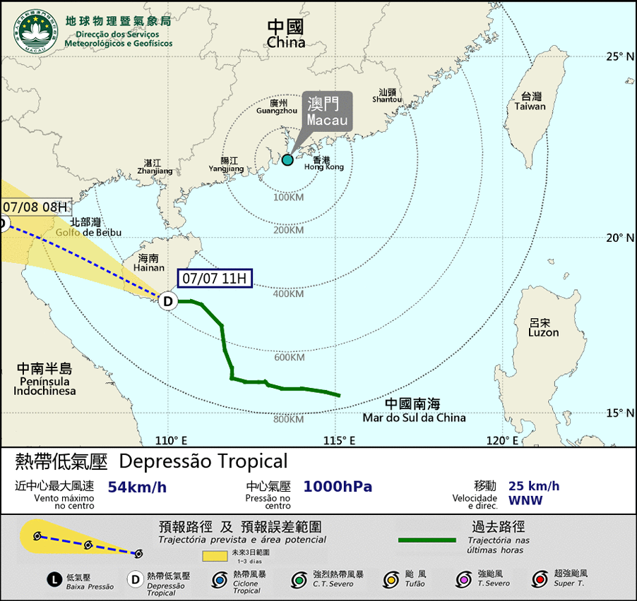 The tropical depression will make landfall in Hainan Island around noon. It is expected to weaken and depart from Macao after landing. The Tropical Cyclone Signal No.1 will remain in force for a while. When the tropical depression further moves away, all Tropical Cyclone Signals will be canceled then.
