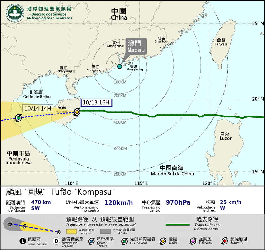 Typhoon “Kompasu” has landed on Hainan Island and is moving away from Macau, so Macau is unlikely to have strong wind. SMG will change to Tropical Cyclone Warning Signal No.3 at 5:30 pm. However, as Macau is still affected by the circulation of "Kompasu", Macau will still have showers and thunderstorms in the next few hours, and the wind will occasionally reach wind force level 6 - 7, with gusts.