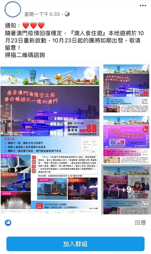 Following the announcement that the “Stay, Dine and see Macao” local tours will resume on 23 October, local travel agencies fervently spotlight local tours via different online platforms such as WeChat and Facebook in hoping of attracting more signups among residents.