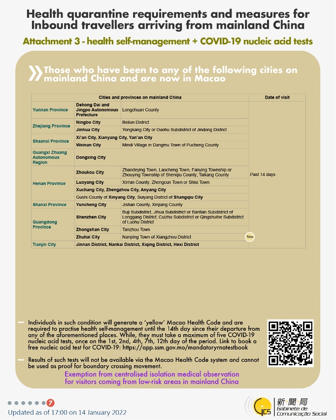 [infographic] 14 January 2022 health quarantine requirements and measures for inbound travellers of different identities.