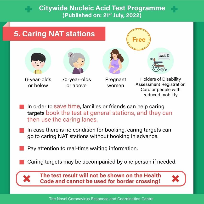 The Novel Coronavirus Response and Coordination Centre states that, to coordinate with the anti-epidemic measures in the “consolidation period” in the coming week, in the 13th round of the Citywide NAT Programme (from 08:00 on 22 July 19:00 on 23 July), in addition to the 10 pieces of KN95 masks, each resident will receive 5 rapid antigen test kits. Re-collection of such supplies would not be available. Please refer to the pictures attached (infographics) for details of the 13th round of the Citywide NAT Programme.