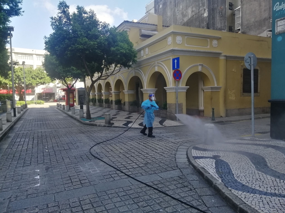 With the epidemic prevention work entering the consolidation period, the Municipal Affairs Bureau (IAM) continuously coordinates with the outsourced company to increase the manpower for stepping up the cleaning and disinfection of the public streets and public facilities all over Macao. In addition, IAM appeals to all members of the public in Macao to jointly maintain environmental hygiene in the city and be persistent in epidemic control and prevention, so as to reduce the risk of the spread of virus with concerted effort.