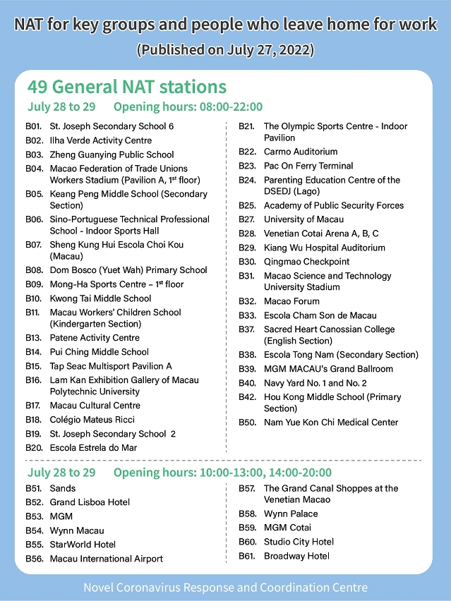 The Novel Coronavirus Response and Coordination Centre announces that, in response to the need for nucleic acid testing of people in key areas, key groups and those leaving home for work, starting from tomorrow (28 July), the service hours of the following NAT stations will be adjusted to 08:00-22:00; this involves 6 general stations and 1 caring station: