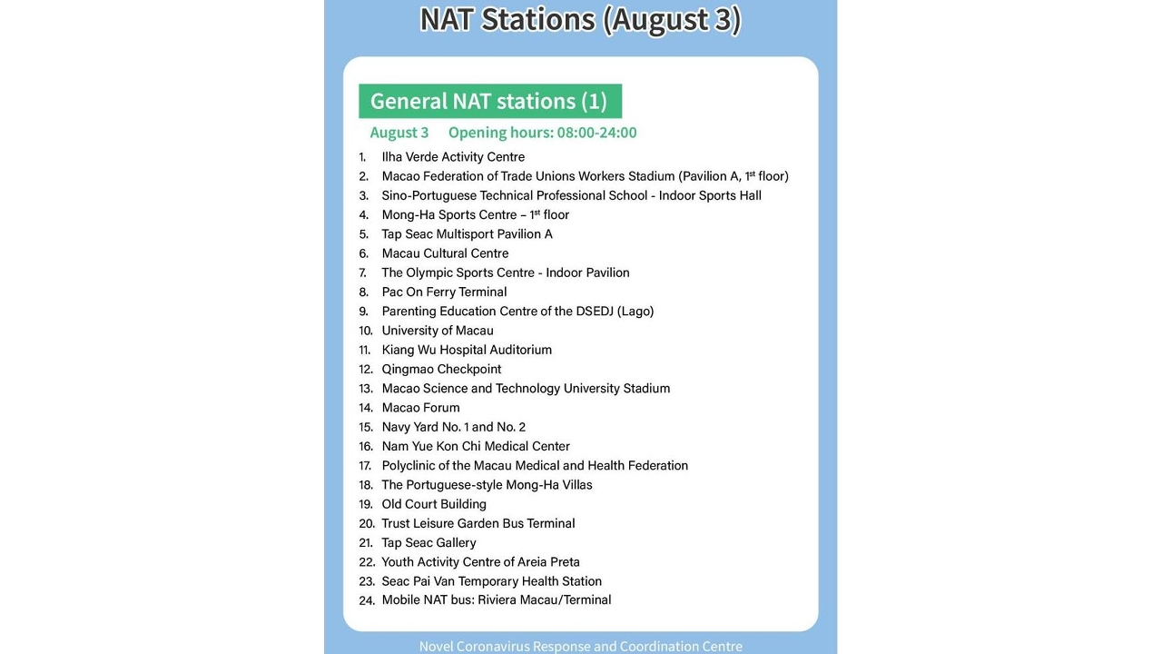 ● 53 General Stations will open from 08:00 to 24:00; amongst, NAT stations at Sands Casino, Grand Lisboa Hotel, MGM Macau, Wynn Macau, StarWorld Hotel, Venetian – Grand Canal Shoppes, Wynn Palace, MGM Cotai, Studio City Macau, and Broadway Hotel will open from 10:00 to 13:00, and from 14:00 to 24:00; NAT station at Macau International Airport will open from 10:00 to 13:00, and from 14:00 to 20:00; in addition, NAT stations at Iao Hon Market Park, Iao Hon Market Park (special lane for red code holders), Lilau Square, Luís de Camões Park, Flora Garden, Leisure Area in Baía Norte do Fai Chi Kei, Leisure Area in Bairro Social de Tamagnini Barbosa, Triangular da Areia Preta Garden, Leisure Area in Rua da Pérola Oriental, Areia Preta Urban Park (near Areia Preta Health Centre), Leisure Area of Rua Quatro do Bairro Iao Hon, Leisure Area of Rua da Missão de Fátima, Travessa 1º de Maio, Comendador Ho Yin Park (The Sculpture Park of the Chinese Ethnics), Leisure Area of Hong Kung Temple, Nam Van Lake (the white tent), and Areia Preta Urban Park (near motorcycles inspection centre) will open from 07:00 to 24:00.