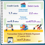 According to statistics released today by the Monetary Authority of Macao, the total numbers of personal credit cards and debit cards issued by banks in Macao increased in the first quarter of 2023. The credit card and debit card turnover both witnessed quarter-to-quarter growth. On the other hand, the number and the value of transactions of local mobile payment tools both retreated on a quarterly basis.