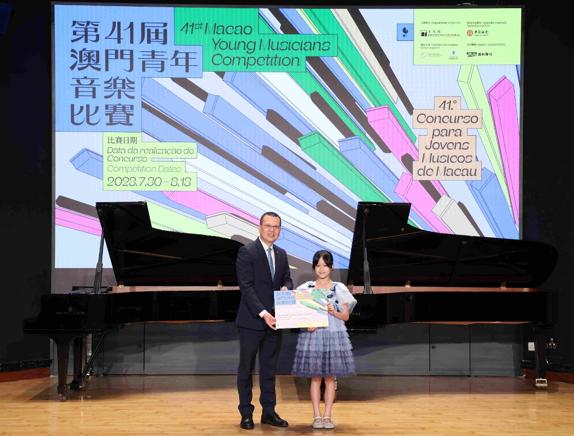 The 41st Macao Young Musicians Competition, organised by the Cultural Affairs Bureau (IC, from the Portuguese acronym), was successfully concluded. The Special Prizes Competition and awards ceremony was held on 13 August at the Grand Hall of Inspiration Building of the Macao Institute for Tourism Studies. On the occasion, three Special Prizes were presented by the Vice President of the Cultural Affairs Bureau, Cheang Kai Meng, and the Chief Executive of the Bank of China (Macau) - special supporting entity of the event, Chan Hio Peng.