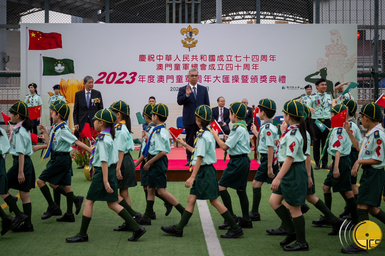 The Secretary for Security, Mr Wong Sio Chak, represents the Chief Executive at a ceremony held by the Scout Association of Macao to celebrate the 74th anniversary of the founding of the People's Republic of China and the association's 2023 Annual Parade and Awards Ceremony.