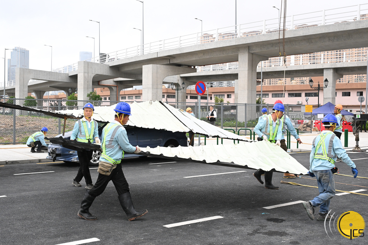 "Crystal Fish 2024" typhoon drill – an upturned speedboat is washed ashore, resting on a major road, Public Security Police Force officers coordinate the use of machinery and construction company personnel to have it removed.