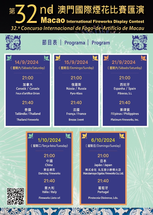 For more information about the 32nd Macao International Fireworks Display Contest in celebration of the 75th anniversary of the founding of the People’s Republic of China and the 25th anniversary of the establishment of the Macao SAR, interested individuals can visit the event website:https://fireworks.macaotourism.gov.moor follow MGTO on social media such as WeChat, Weibo, Xiaohongshu and Douyin.