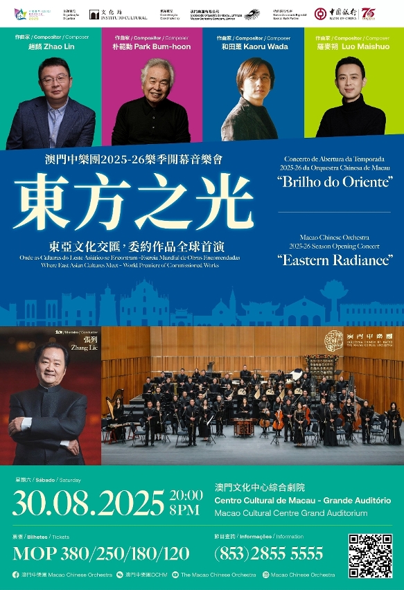 Tickets for the Macao Chinese Orchestra 2025–26 Concert Season are on sale through the Macau Ticketing Network from 29 August (Friday), with various discounts available. In order to celebrate Macao’s designation as a “Culture City of East Asia - Macao, China”, Macao residents who purchase tickets for the Season Opening Concert “Eastern Radiance” can enjoy an exclusive 50% discount. Some programmes will also feature the “Chinese Music Appreciation” Package and the “Discover New Chinese Music” Package. For enquiries, please call 2882 2860 during office hours. 24-hour ticketing hotline: 2855 5555; ticketing website: www.macauticket.com.