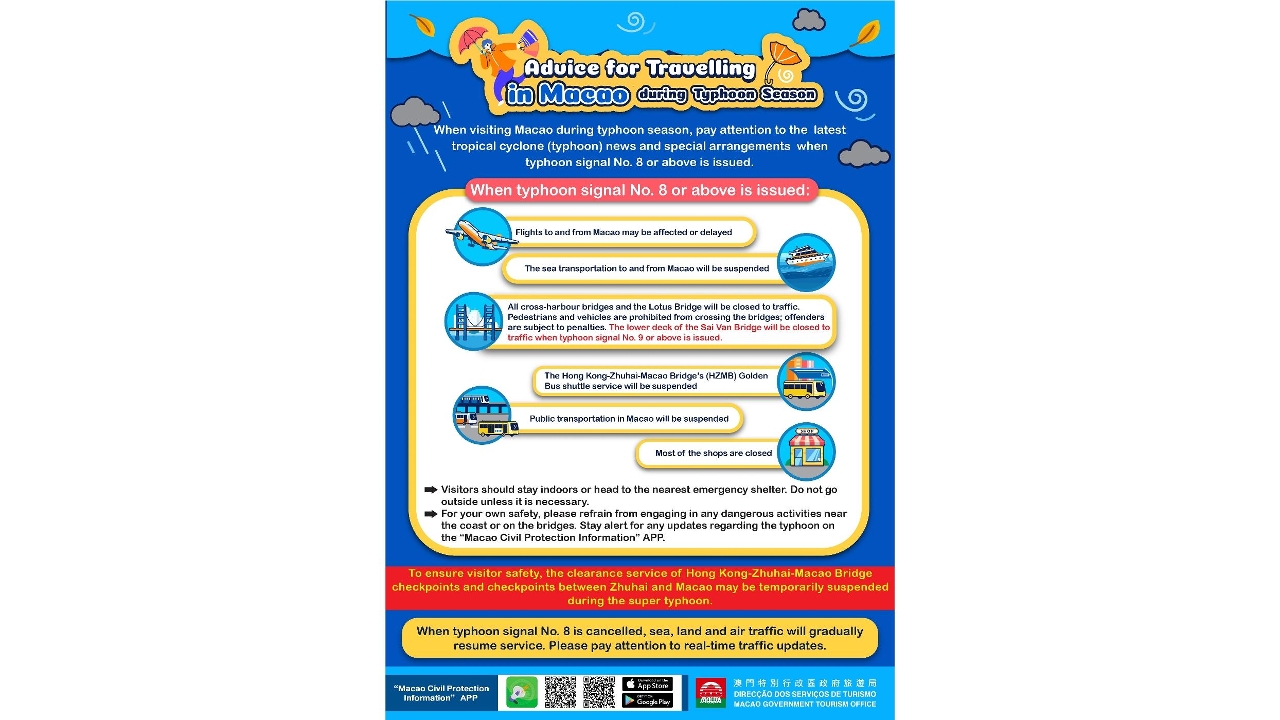 According to information provided by Macao Meteorological and Geophysical Bureau (SMG), typhoon signal No. 8 will soon be hoisted in Macao. Upon issuance of typhoon signal No. 8, Macao Government Tourism Office (MGTO) will notify Macao residents in other destinations and visitors in Macao by mobile text about typhoon signal No. 8 in effect and the suspension of all public transportation services during typhoon signal No. 8 or above in Macao. MGTO urges visitors to stay in a safe place and avoid going out while paying close attention to the latest updates and civil protection information on Macao Meteorological and Geophysical Bureau (SMG)’s website: https://www.smg.gov.mo/en and Government Information Bureau’s website: https://www.gcs.gov.mo/news/home/en , or by downloading the mobile app named “Macao Civil Protection Info”. They may also obtain the latest weather news reposted on MGTO’s website and platforms on social media. Tourism Hotline (2833 3000) remains in service 24 hours a day.