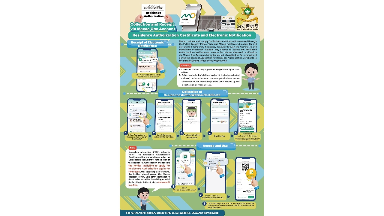 For detailed information about the collection of Residence Authorization Certificate, citizens may visit the website of the Public Security Police Force (www.fsm.gov.mo/psp), call the service hotline at 28725488 or send email to sminfo@fsm.gov.mo. As for information about the renewal of identity card, please visit the website of the Identification Services Bureau (www.dsi.gov.mo), call the hotlines at 28370777 or 28370888 or send email to info@dsi.gov.mo.