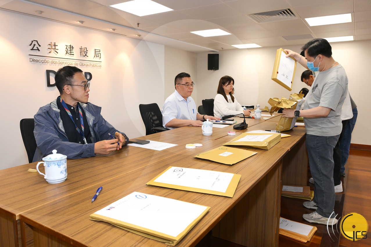Officials of the Public Works Bureau open tender documents for a maintenance project of Sai Van Bridge facilities.