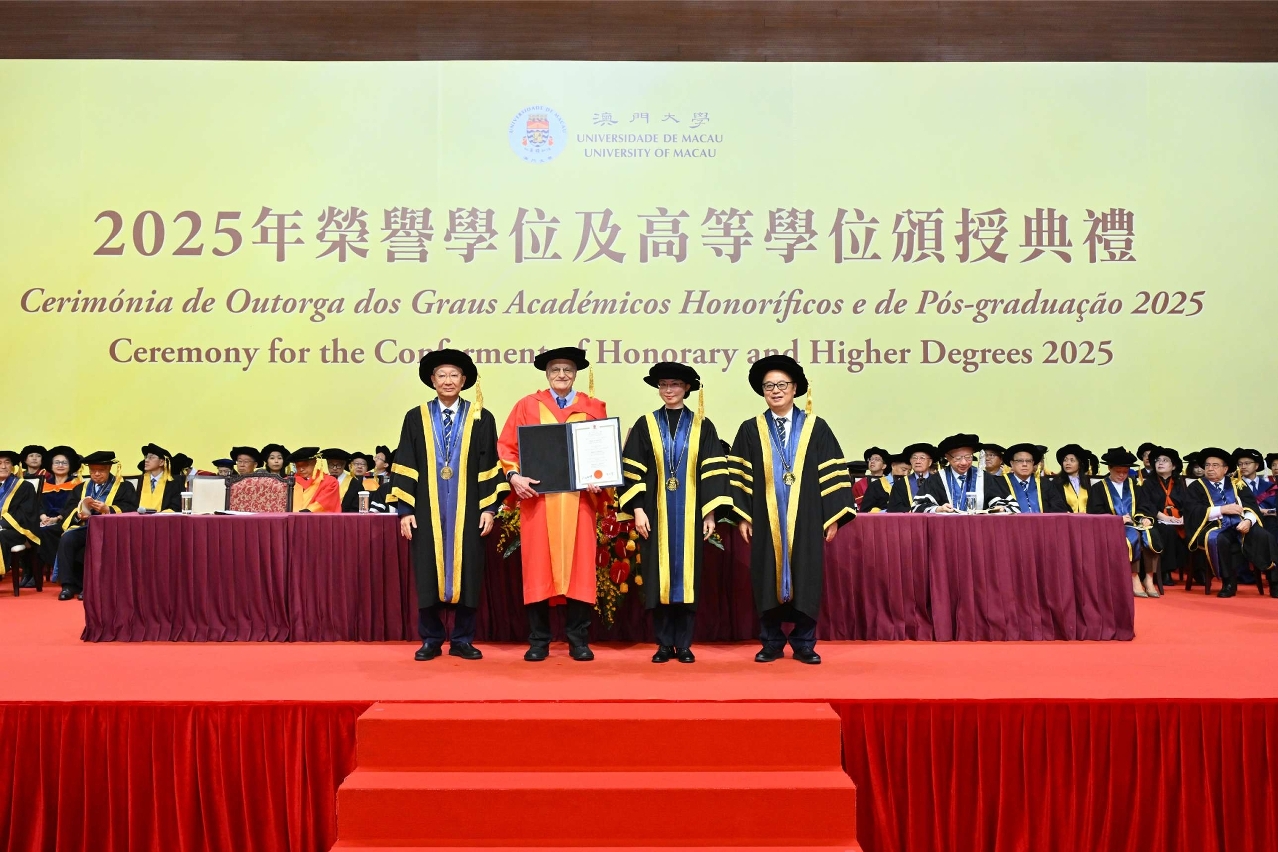 The University of Macau (UM) held the Ceremony for the Conferment of Honorary and Higher Degrees 2025 today (30 November). During the ceremony, the university conferred honorary doctorates on Ze Zhang, a leading scholar in crystal structure in materials science, and Thomas J. Sargent, Nobel laureate in Economic Sciences, in recognition of their outstanding achievements and significant contributions to society.