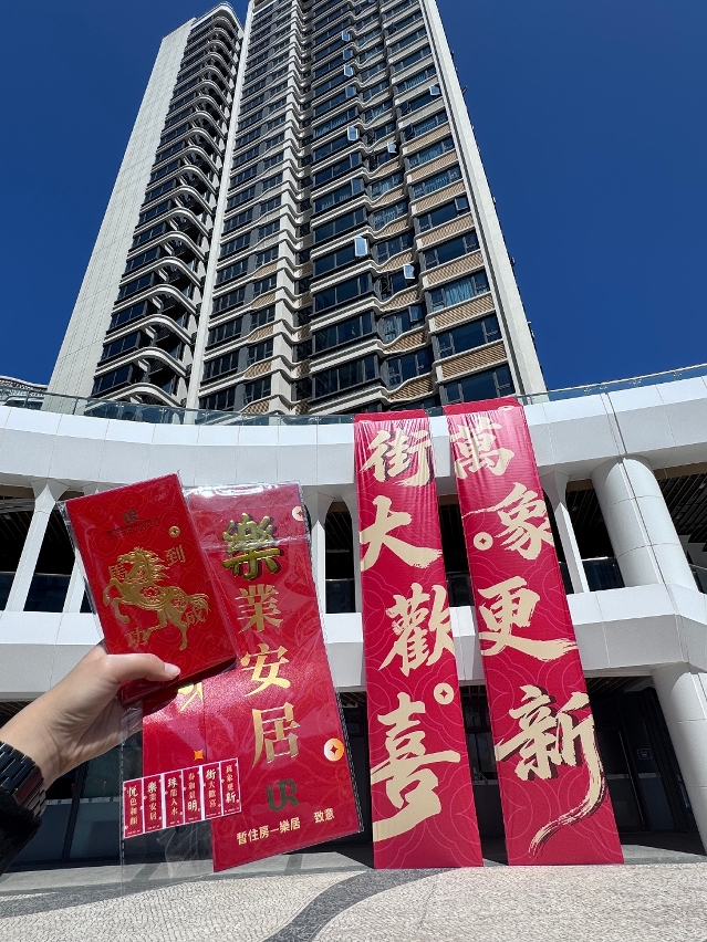 During the Chinese New Year holiday period, the Hengqin sales centre and show flats of Macau New Neighbourhood (MNN) will remain open. A variety of “Good Luck” photo installations have been set up on-site to celebrate Chinese New Year. Visitors will have the opportunity to win a set of MNN fai chun (spring couplets) or lai see (red envelopes) by posting their photos on social media, while stocks last. All interested individuals are welcome to take the shuttle bus from the port to visit and browse.