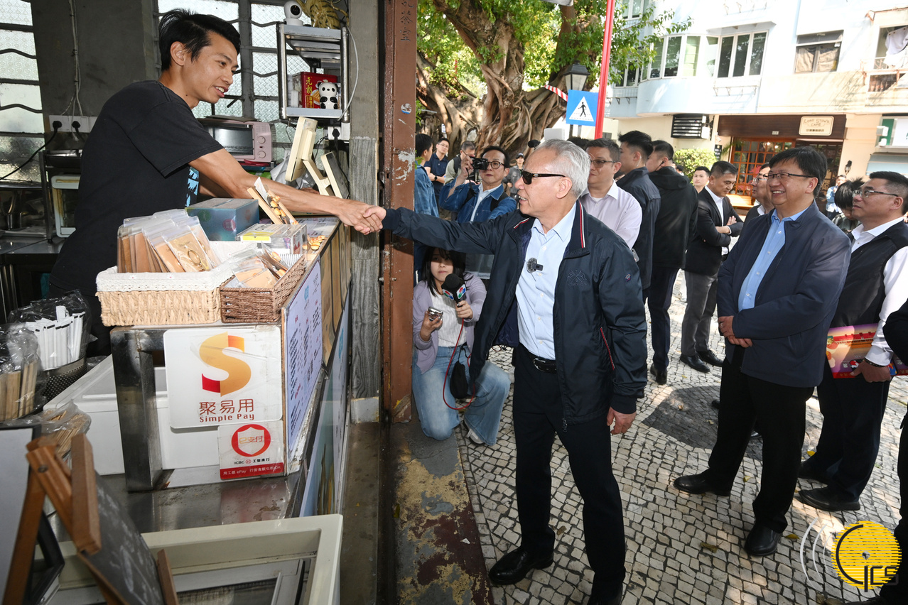 Later, Mr Sam went to Taipa – accompanied by the Secretary for Administration and Justice, Mr Wong Sio Chak – to learn about the revitalised Taipa Market. While there, he talked with stallholders, learning how the upgraded environment has improved their daily operations and business performance. He visited the newly-established “Gastronomy + Culture and Creativity Area” within the Taipa Market, and listened to briefings on initiatives to upgrade traditional wet markets and promote their long-term sustainability. Subsequently, together with the Secretary for Economy and Finance, Mr Sam visited local businesses in Taipa Village to understand their trading conditions during the festive season, as well as during ordinary periods.