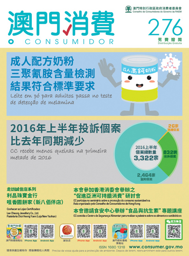 Consumer Council published a test on adult milk powder in its latest issue no. 276 Consumer Report and all 15 samples examined contain no melamine. A detailed analysis of the number of cases received by the Council is also included in the magazine. The Council and Food Safety Centre of IACM continue to work together to safeguard consumers’ safety, this year, the two departments spot checked adult milk powder for their melamine content. The Council and Food Safety Centre examined 15 batches from 13 brands of adult milk powder and conducted the test based on China’s national standard. All samples examined are found to have no melamine that affects human’s health. Prolonged or heavy consumption of melamine result in kidney stones, which affect the bladder and excretory system, therefore, examination of dairy products is one of the measures to ensure consumers’ health safety. The test result is now published in issue no. 276 Consumer Report and a feature on how to choose adult milk powder, and on reading the ingredients list is included. The Council received 832 complaints, 2,464 enquiries, and 26 suggestions in the first half of 2016. A detailed analysis is included in the latest issue of Consumer Report. Consumer Report is now available free of charge at the Council (Av. Horta e Costa, N.º 24-A, Edf. Cheung Heng, R/C), and the service counter of the Council at Macao SAR Government Service Centre (Rua Nova da Areia Preta, Nº52), Public Information Centre at Vicky Plaza, libraries and bookstores. Consumers may also access the magazine online on the Council’s official website (http://www.consumer.gov.mo) and WeChat official account. For enquiry, please call 8988-9315.