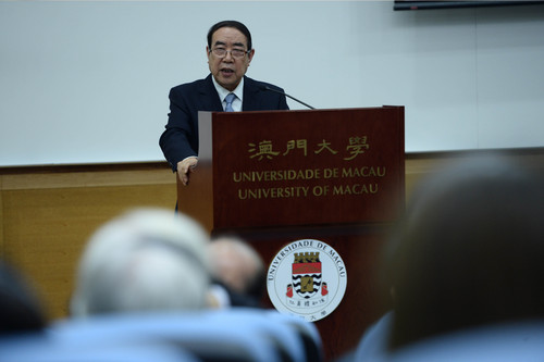 Tam Chon Weng, Secretary for Social Affairs and Culture and representative of Chief Executive and UM Chancellor Dr Chui Sai On, presented the honorary doctorate to Dr Jia in the company of UM’s University Council Chair Lam Kam Seng and UM Rector Wei Zhao, amid thunderous applause from the audience. Rector Zhao said that Chinese literature is one of the key disciplines at UM, as every world-class university should have a world-class academic programme focused on the native language of the country in which the university is located.