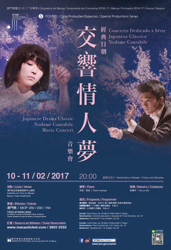 The Japanese Drama Classic “Nodame Cantabile Music Concert” is held at the Macao Tower Auditorium. Tickets for the concert are priced at MOP250, MOP200 and MOP150, with various discount packages available. Ticketing hotline: (853) 2855 5555. For details and enquiries about the programme, please contact OM through tel. no. 2853 0782 during office hours or visit Macao Orchestra’s official webpage www.icm.gov.mo/om.