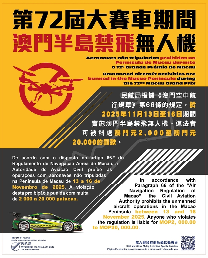 According to Article 66 of the "Air Navigation Regulation of Macao" approved by Executive Order No. 43/2021, the Civil Aviation Authority announces that an unmanned aircraft ban will be enforced on the Macau Peninsula from November 13 to 16, 2025, throughout the entire day.