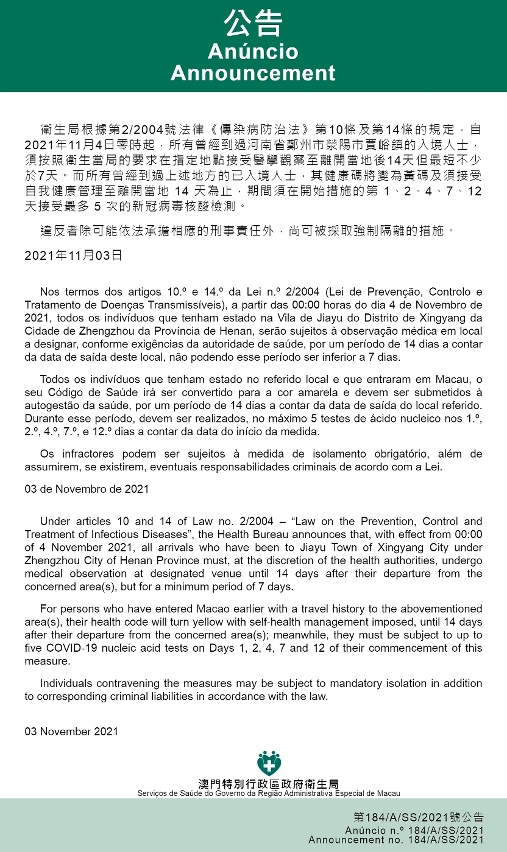 O Centro de Coordenação de Contingência do Novo Tipo de Coronavírus informa que tendo em consideração a evolução epidemiológica mais actualizada da Província de Henan, os Serviços de Saúde, de acordo com os dispostos nos artigos 10.º e 14.º da Lei n.º 2/2004 (Lei de Prevenção, Controlo e Tratamento de Doenças Transmissíveis), determinam que a partir das 00:00 horas do dia 4 de Novembro de 2021, todos os indivíduos que tenham estado na Vila de Jiayu do Distrito de Xingyang da Cidade de Zhengzhou da Província de Henan, serão sujeitos à observação médica em local a designar, conforme exigências da autoridade de saúde, por um período de 14 dias a contar da data de saída deste local, não podendo esse período ser inferior a 7 dias.