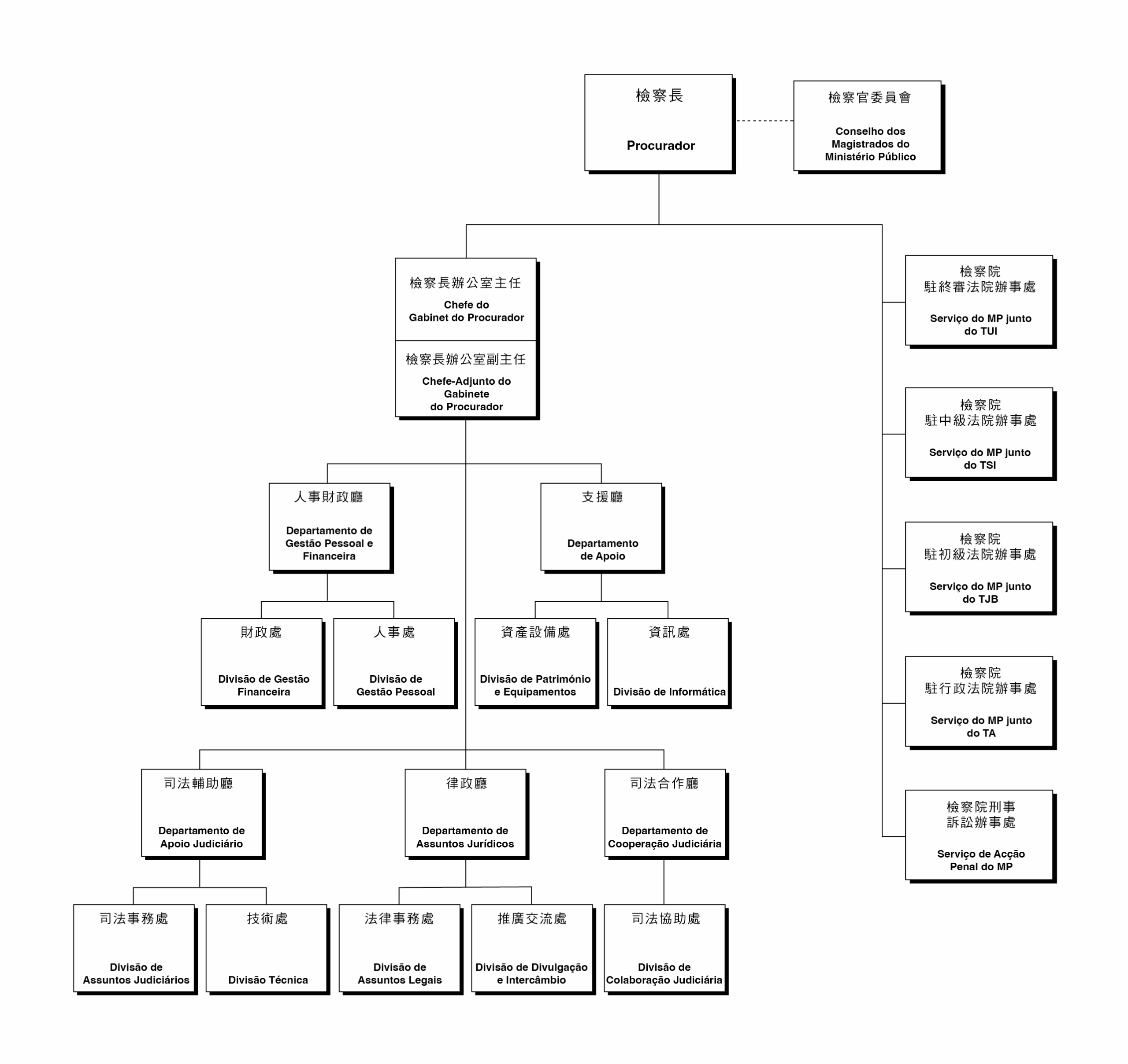 São atribuições do Ministério Público a representação em juízo da Região Administrativa Especial de Macau, o exercício da acção penal, a defesa da legalidade e dos interesses que a lei determine; as circunstâncias em que o Ministério Público exerça a competência de fiscalização quanto à aplicação da Lei Básica da Região Administrativa Especial de Macau são fixadas pelas leis de processo.