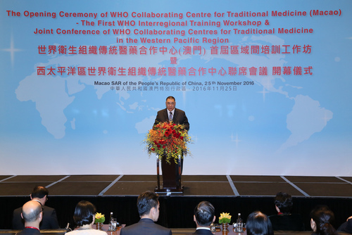 Com o intuito de implementar o desenvolvimento de medicina tradicional a nível internacional, construindo uma plataforma de colaboração e de intercâmbio na área de medicina tradicional, e em simultâneo coordenar com a execução das “Estratégias de Medicina Tradicional da Organização Mundial da Saúde 2014-2023, Macau recebeu, sexta-feira, 25 de Novembro a Conferência Conjunta do Centro de Cooperação de Medicina Tradicional da Organização Mundial da Saúde da Região do Pacifico-Ocidental A cerimónia contou com a presença do Chefe do Executivo, Dr. Chui Sai On, da Directora-geral da Organização Mundial da Saúde, Doutora Margaret Chan, do Vice-Director da Comissão Nacional de Saúde e Planeamento Familiar e Director da Administração Estatal de Medicina Tradicional Chinesa, Dr. Wang Guoqing. Estiveram também presentes na cerimónia o Vice-diretor do Gabinete de Ligação do Governo Popular Central na Região Administrativa Especial de Macau, Sr. Xue, Xiaofeng, o Comissário do Gabinete de Comissário do Ministério dos Negócios Estrangeiros na Região Administrativa Especial de Macau, Sr. Ye Dabo, o Director dos Serviços para a Alimentação e Saúde de Hong Kong, Dr. Ko Wing Man, o Secretário para os Assuntos Sociais e Cultura, Doutor Alexis Tam Chon Weng, o Director-Geral Adjunto da Organização Mundial de Saúde, Doutor Ren Minghui e o Director dos Serviços de Saúde, Dr. Lei Chin Ion. O Chefe do Executivo da RAEM, Dr. Chui Sai On, afirmou que o Governo pondera o desenvolvimento da medicina tradicional chinesa, em especial na atenção dada na gestão normalizada da medicina tradicional chinesa, na optimização do sistema de fiscalização de medicina tradicional chinesa e na melhoria do mecanismo de supervisão e gestão. Afirmou também que o Governo da RAEM irá colocar a industria da medicina tradicional chinesa como um dos principais elementos na promoção da diversificação da economia de Macau promovendo o ajustamento da estrutura industrial de Macau. O chefe do executivo, Dr. Chu Sai On, afirmou também que o Parque Cientifico e Industrial da Medicina Tradicional Chinesa construído por Macau na Ilha de Hengqing, província de Guangdong (Cantão) permite estabelecer a ponte com os países da língua portuguesa, impulsionando a industrialização e a internacionalização da medicina tradicional chinesa. O Governo da RAEM vai, ainda, de acordo com o plano estratégico “uma faixa, uma rota” prevista pelo Governo Central, reforçar a colaboração na área de medicina tradicional com os países que aderirem a este plano, participando activamente no desenvolvimento de estruturas da medicina tradicional chinesa. O chefe do executivo, Dr. Chu Sai On, afirmou, ainda, que a criação do Centro de Cooperação de Medicina Tradicional da Organização Mundial da Saúde em Macau representa o reconhecimento internacional do desenvolvimento da medicina tradicional em Macau o que aumenta a responsabilidade da RAEM daí que o Governo assumirá a responsabilidade resultante do processo de credibilização e afirmação da medicina tradicional chinesa permitindo que maus pessoas possam reconhecer os méritos, segurança e valor da medicina tradicional. Por seu turno a Directora-geral da Organização Mundial da Saúde, Dr.ª Margaret Chan, relevou o papel do Governo da RAEM no apoio ao desenvolvimento da medicina tradicional e aos trabalhos desenvolvidos pela OMS, esperando que a realização de 1.º Workshop de Formação Inter-regional possa fazer com que mais cidadãos gozem de uma excelente qualidade de serviços de saúde e assim perceberem a importância de medicina tradicional para saúde universal. Margaret Chan confia que seja possível que a medicina tradicional e medicina moderna possam ser complementares. Já o vice-Director da Comissão Nacional de Saúde e Planeamento Familiar e Director da Administração Estatal de Medicina Tradicional Chinesa, Dr. Wang Guoqing, salientou que o Governo da RAEM, além de dar grande importância ao desenvolvimento de medicina tradicional chinesa no sistema de medicina e saúde, também propõe que a medicina tradicional chinesa seja um sector essencial da diversificação adequada da economia, promovendo, de forma aprofundada, a sua modernização e internacionalização, criando uma plataforma com maior apoio. Na conferência Dr. Wang Guoqing apresentou três sugestões: 1). Desenvolver, de forma completa, as funções de plataforma - Centro de Cooperação de Medicina Tradicional, e criar um mecanismo de intercâmbio para obter mais referências em diversas áreas. 2). Promover a medicina tradicional de modo a que esta seja mais um recurso para a saúde e todas as pessoas possam gozar desse recurso. 3). Estimular a complementaridade entre medicina tradicional e moderna, promover o seu desenvolvimento conjunto de modo a para concretizar a normalização, padronização e modernização de medicina tradicional. Os 180 convidados da Conferência Conjunta do Centro de Cooperação de Medicina Tradicional da OMS Região do Pacifico-Ocidental são provenientes de 25 países ou regiões, nomeadamente, China Continental, Regiões Administrativas de Hong Kong e Macau, Estados Unidos da América, Australia, Nova Zelândia, Coreia do Sul, Egipto, Filipinas, Camboja, Bielorrúsia, Costa do Marfin, Cuba, República Popular Democrática de Coreia, Quénia, República Democrática Lau, República de Mali, Namíbia, Nepal, Nicaragua, Sudão, Vietam, Suiça, Bengala e Nigeria. Estiveram também presentes o Chefe do Centro da Centro de Cooperação de Medicina Tradicional da Organização Mundial da Saúde do Pacifico-ocidental, chefias, peritos, académicos, membros do Conselho para os Assuntos Médicos do Governo da Região Administrativa Especial de Macau e representantes das entidades ou associações da medicina tradicional chinesa. O “Plano de Cooperação na área de medicina tradicional” celebrado em 2011 entre o Go
