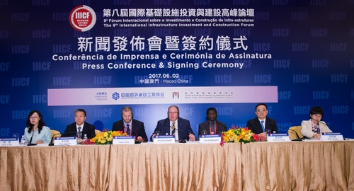 Realizaram-se hoje a cerimónia de assinatura de acordos e uma conferência de imprensa do 8.º IIICF. O referido certame contou com a orientação do Ministério do Comércio da República Popular da China, do Governo da Região Administrativa Especial de Macau (RAEM) e do Gabinete de Ligação do Governo Popular Central na RAEM, sob a organização conjunta da Associação dos Construtores Civis Internacionais da China e do Instituto de Promoção do Comércio e do Investimento de Macau (IPIM). Foram convidados para participar na conferência de imprensa, atrás mencionada, o Vice-Presidente do Banco Mundial, Dr. Hartwig Schafer, o Ministro de Energia de Zâmbia, Dr. David Mabumba, o Ministro das Comunicações e Transporte de Bósnia e Herzegovina, Dr. Ismir Jusko, o Conselheiro Comercial do Departamento de Assuntos da América e Oceânia do Ministério do Comércio da República Popular da China, Dr. Shao Yingjun, o Presidente da Associação dos Construtores Civis Internacionais da China, Eng. Fang Qiuchen, e o Presidente do Instituto de Promoção do Comércio e do Investimento de Macau (IPIM), Dr. Jackson Chang.