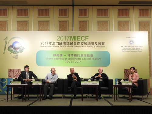 O “Dia da Cooperação Empresarial Verde” é uma das actividades que se realizam durante o MIECF 2017, incluindo sessões de debate e uma cerimónia de assinatura de acordos. Este ano, o “Dia da Cooperação Empresarial Verde” foi dividido em duas sessões, atraindo cerca de 380 participantes. A sessão sobre “O Futuro da Indústria de Manufactura – Economia Inovadora Sustentável” centrou-se nos desafios enfrentados pela indústria transformadora tradicional durante o período de transição. Influenciada por factores como modelos inovadores de negócios, uma nova era de consciencialização sobre as emissões de carbono e a procura dos consumidores por empresas que apostem num desenvolvimento sustentável, tornou-se necessário para a indústria de manufactura encontrar um novo caminho com base num desenvolvimento verde. O Presidente e membro fundador da Associação das Indústrias Ambientais de Macau, Eng. António Trindade, foi o moderador da primeira sessão. A sessão contou com os seguintes oradores: o Presidente e Director Executivo da Carbon Partners Asiatica, Junji Hatano, o Director Executivo da Spin.Works, Vasco Pimenta; o Presidente da Aliança Internacional Macaense, Roy Eric Xavier; e o Professor Billy Hu da Dyson School of Design and Engineering, Imperial College, em Londres.