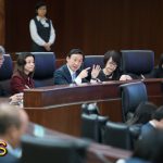 Secretário para os Assuntos Sociais e Cultura, Alexis Tam, responde às interpelações orais dos deputados durante uma sessão plenária na Assembleia Legislativa.