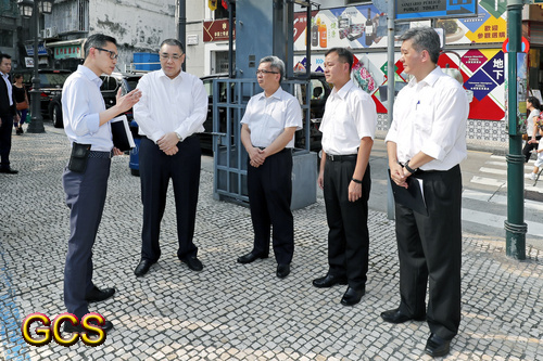 Chefe do Executivo, Chui Sai On, na zona do Largo do Pagode do Bazar e da Rua de Cinco de Outubro a inteirar-se dos trabalhos preparatórios de protecção civil e do plano de evacuação.