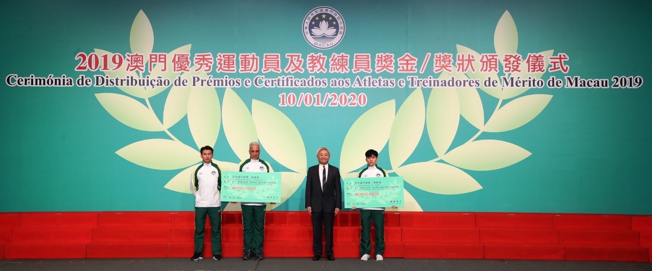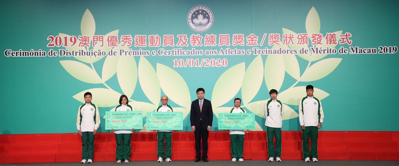 A “Cerimónia de Distribuição de Prémios e Certificados de Mérito Desportivo a Atletas e Treinadores de Macau 2019” presidida pela Secretária para os Assuntos Sociais e Cultura Ao Ieong U, presente em nome pessoal e em representação do Chefe do Executivo, realizou-se hoje (dia 10), pelas 19:30, no Centro de Convenções e Entretenimento da Torre de Macau 4.º andar, por forma a louvar os atletas, treinadores e equipas técnicas de apoio que obtiveram excelentes resultados desportivos nos eventos desportivos de 2019.