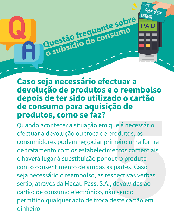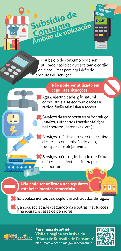 Relativamente às questões que preocupam os residentes no âmbito de utilização do cartão de consumo, a DSE fez os esclarecimentos e produziu infografias. Para as informações mais pormenorizadas sobre estas questões, é favor consultar as “Questões Frequentes” disponíveis na página electrónica exclusiva para o plano de subsídio de consumo(https://www.economia.gov.mo/consumo/zh_TW/faq_consumer.jsp).