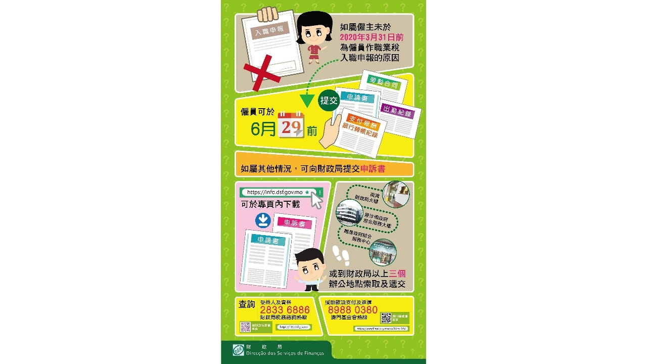 Em relação à consulta sobre as informações e a qualificação dos beneficiários, por favor telefonar para a linha aberta das informações fiscais da DSF, através de 28336886. Em relação ao pagamento e à reposição do apoio pecuniário, por favor ligar à Fundação Macau, através do telefone 89880380. Podem, ainda, os cidadãos aceder à seguinte página electrónica exclusiva: https://info.dsf.gov.mo.