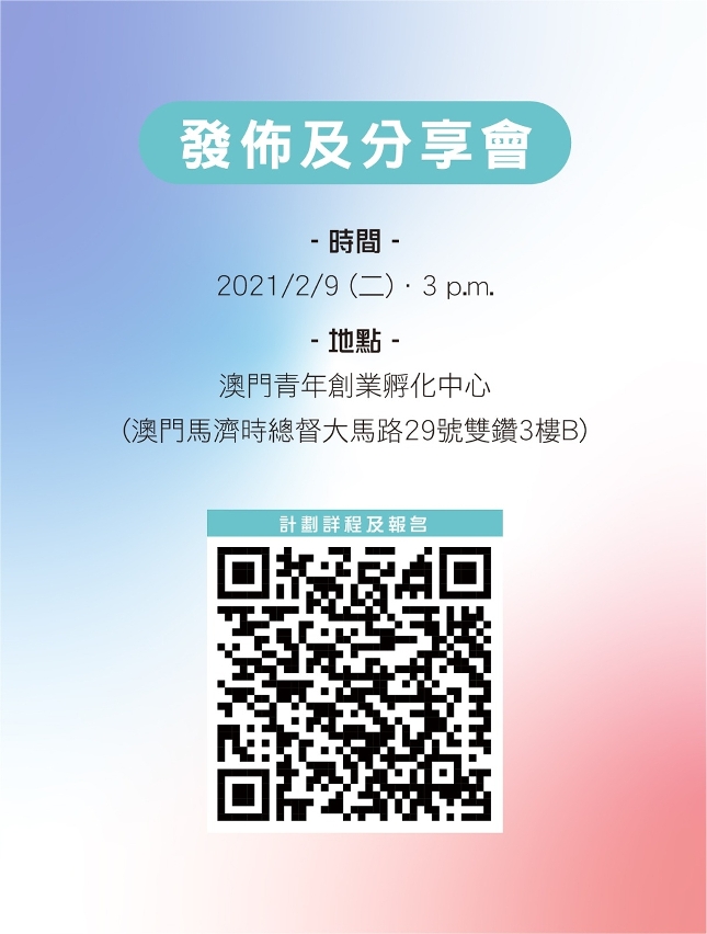 Os jovens interessados de Macau são bem-vindos a participar nesta actividade, podendo, antes do dia 8 de Fevereiro de 2021, aceder à página electrónica da DSAL (https://www.dsal.gov.mo/elearning/public/index.html#/question?code=dHlwZT1wdWJsaWMmaWQ9MTI) ou através da digitalização do código QRpara inscrição. Tendo em consideração os trabalhos de prevenção da pandemia, é estipulado um limite de participantes e só serão aceites inscrições mediante marcação prévia. A inscrição termina logo após esgotadas as vagas. Para mais informações, pode ligar para o número 2870 0277, e para o regulamento do referido plano pode aceder à página electrónica da DSAL (www.dsal.gov.mo).