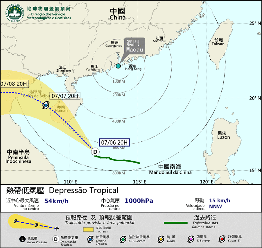 Prevê-se que a depressão tropical localizada na parte central do Mar do Sul da China se desloque para noroeste. Amanhã de manhã, o sistema vai mover-se, genericamente, para a Ilha Hainan. Dado que a depressão tropical se mantém distante de Macau, até início da manhã de amanhã (Dia 7), a possibilidade de emitir o sinal mais alto é baixa. Ao mesmo tempo, Macau não está de momento influenciado por marés astronómicas. A possibilidade de ocorrer “Storm Surge”é baixa.