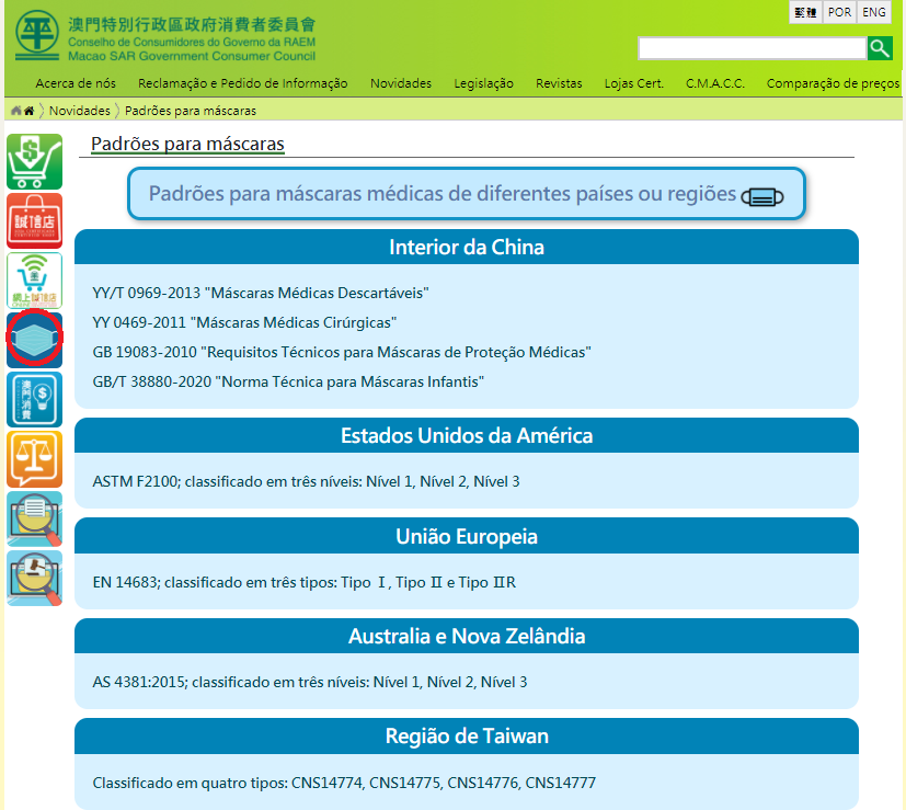 Além disso, a DSEDT e o CC exigiram também a obtenção de certificados de qualidade válidos por parte dos comerciantes, a fim de assegurar que as máscaras para uso medicinal vendidas estejam de acordo com os respectivos padrões internacionais. Apelam-se aos residentes que devem comprar máscaras em estabelecimentos comerciais de boa reputação. O CC já publicou na sua página electrónica ( https://www.consumer.gov.mo/News/mask_standard.aspx?lang=pt ) os padrões de máscaras em diferentes países e regiões para servir como referência aos residentes.