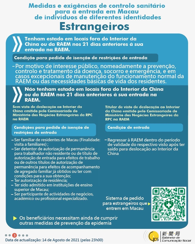 (Infografia)Medidas e exigências de controlo sanitário para a entrada em Macau de indivíduos de diferentes identidades, actualizadas no dia 14 de Agosto de 2021